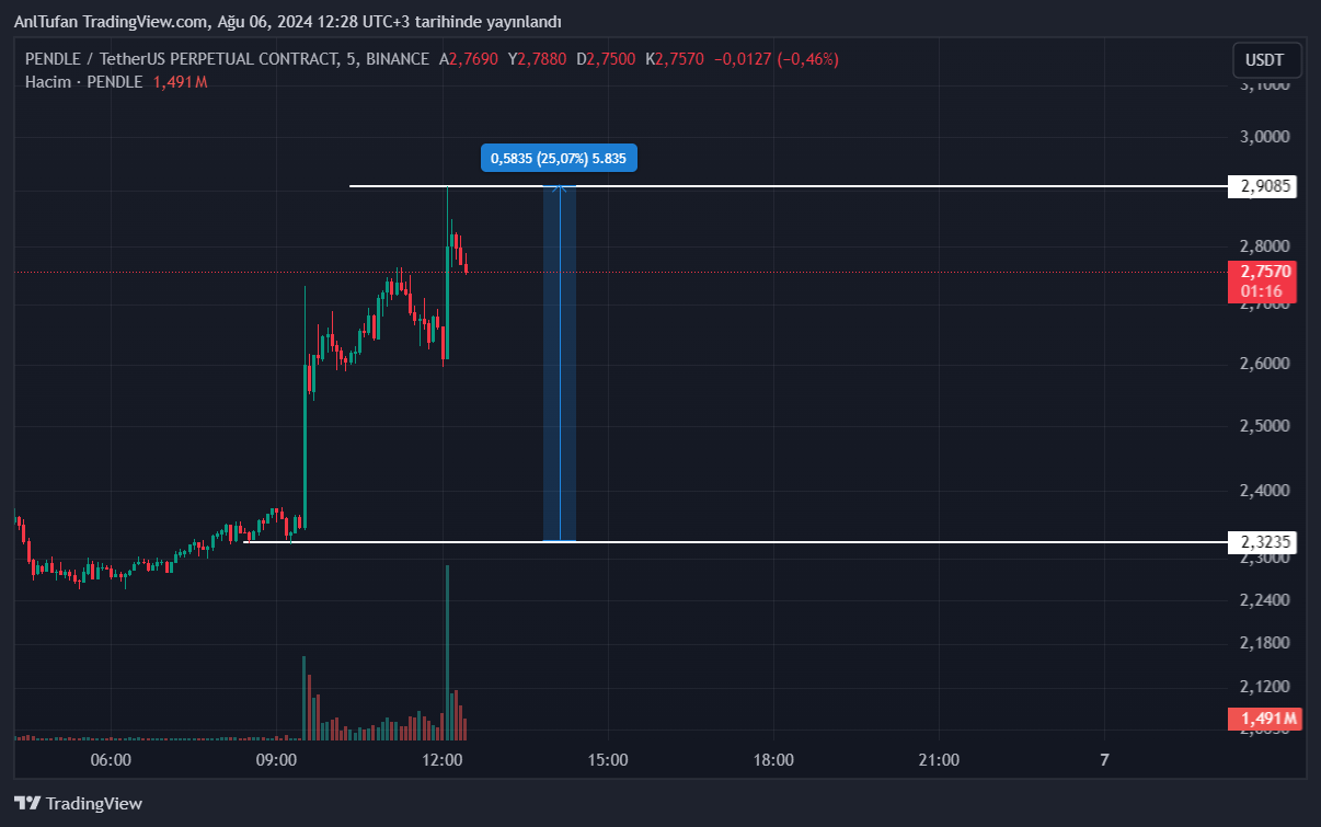 Bu paylaşılan duyuru ile birlikte PENDLE fiyatında yükselişler meydana geldi. Listeleme duyurusu sonrasında %25’lik bir sıçrama yapan PENDLE, dikkatleri üzerine çekmeyi başardı.