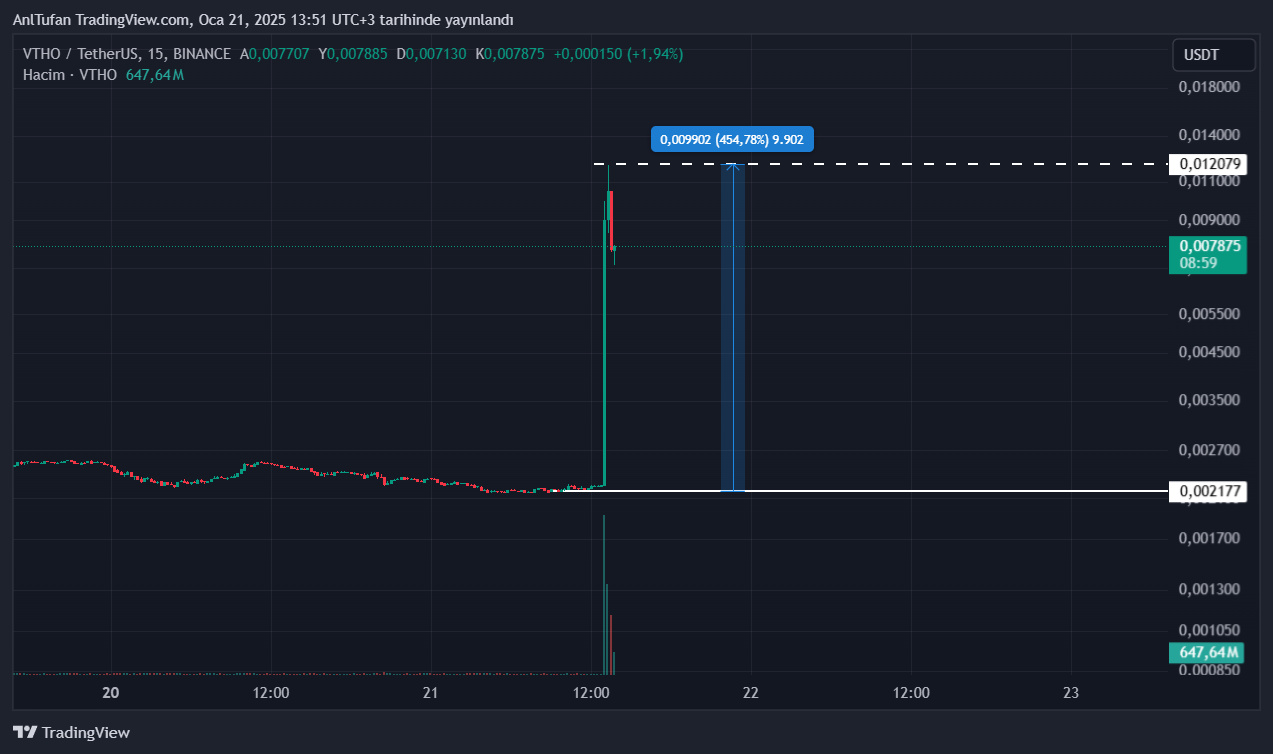Upbit’in listeleme duyurusu sonrasında VTHO fiyatında devasa bir yükseliş meydana geldi. Çok kısa bir süre içerisinde %454 oranında değer kazanarak 5 kattan fazla artış yaşayan VTHO, dikkatleri üzerine çekti.