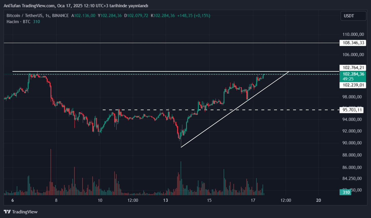 An itibariyle 102.200 – 102.750 dolar seviyelerinde yer alan direnç noktasına ulaşmayı başaran BTC, şimdilik herhangi bir yoğun satış baskısı ile karşı karşıya kalmadı.