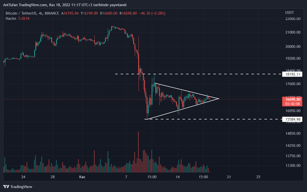Simetrik üçgen formasyonun üst trendi ve yatay direnç seviyesi olan 17 bin dolar noktasından reddedilen BTC, tekrardan alt trend bölgesine doğru hareket etmeye devam ediyor.