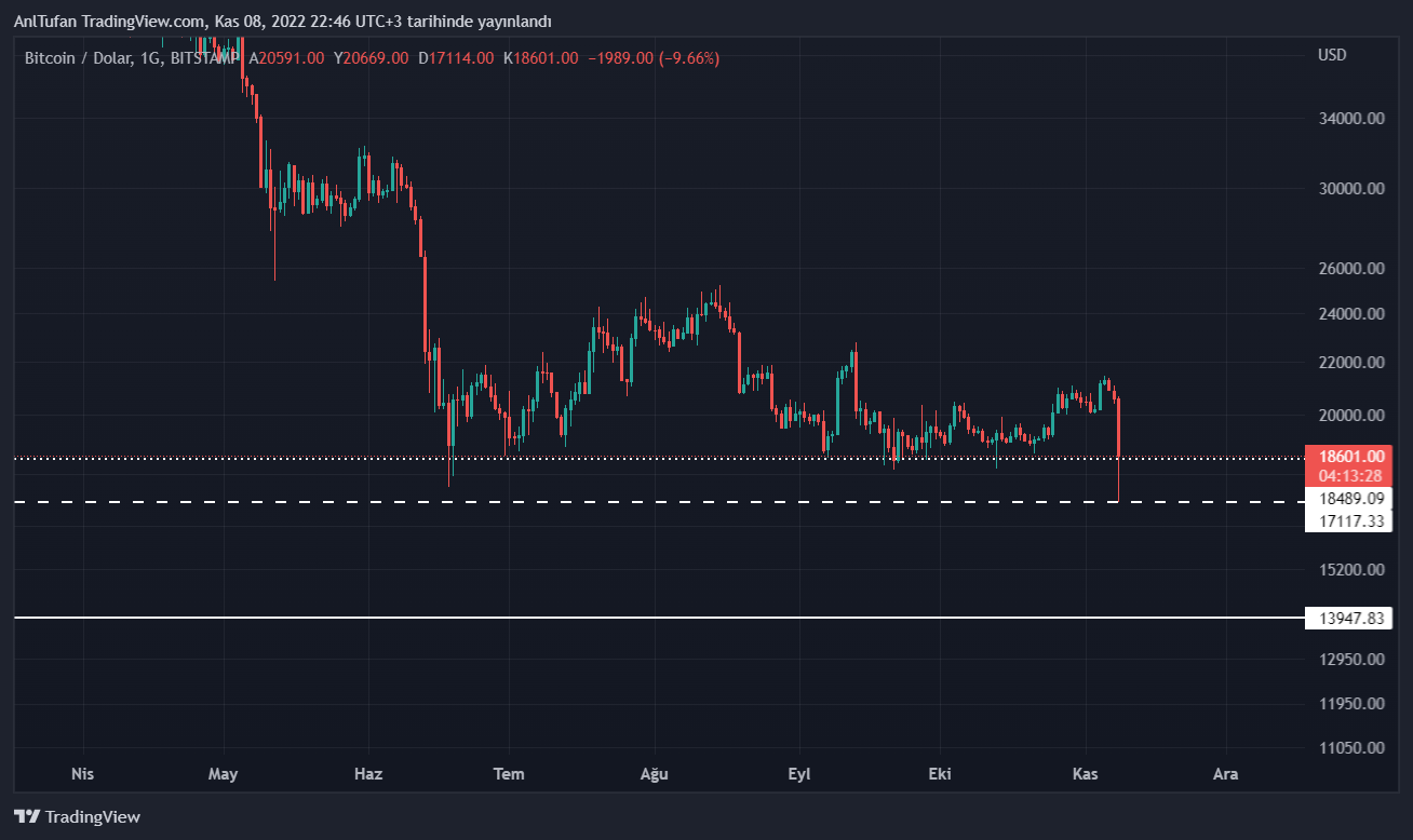 Her ne kadar FTX‘in BTC satışları nedeniyle Bitcoin 17.100 dolara kadar düşüş yaşasa da, şuan itibariyle bu seviyeden tepki alarak tekrardan 18.500 doların üzerine çıkmayı başardı.