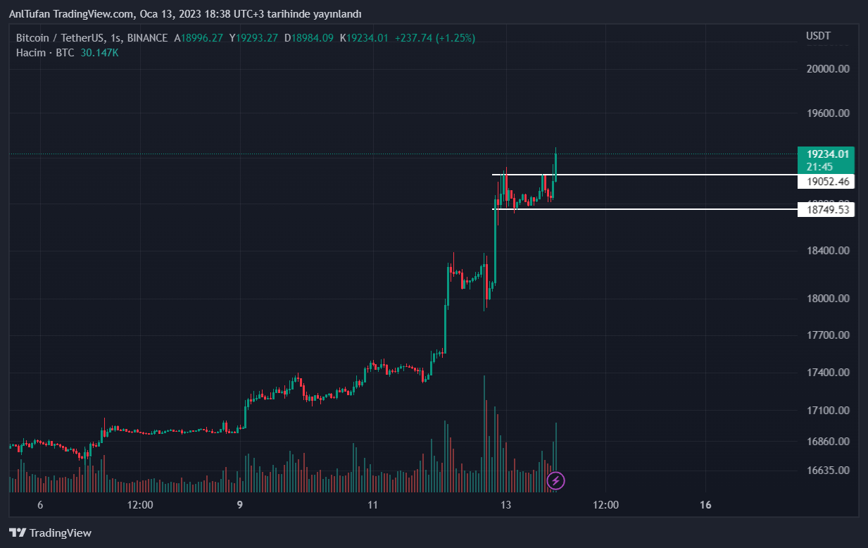 Son dakikalarda Bitcoin’in bir direnç seviyesini daha aştığı gözlenmekte. 19.050 doları hacimli bir şekilde kırmayı başaran BTC, yükselişine devam etmekte.