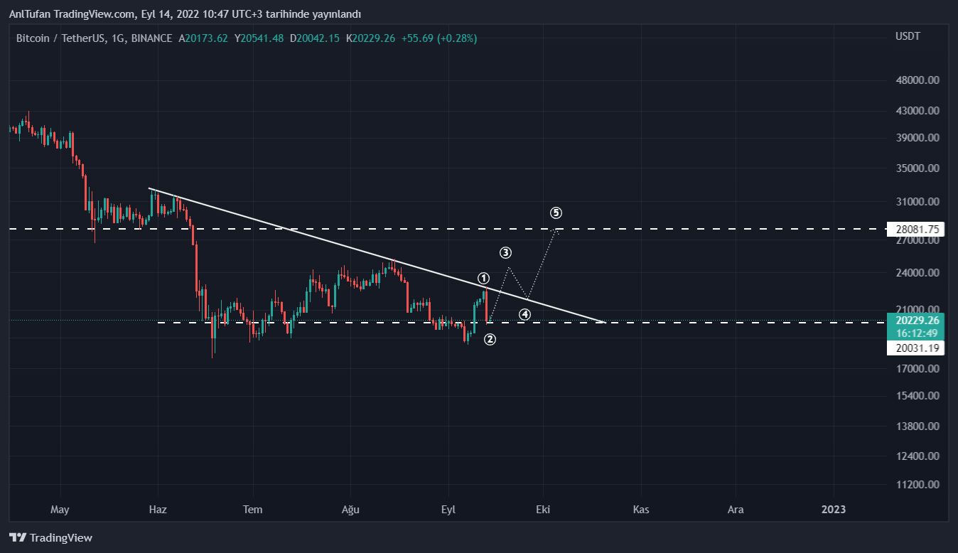 3. dalga için tekrardan yukarı yönlü bir trend başlatacağı tahmin edilen BTC, major düşen trend seviyesi olan 22.200 doları aştığı takdirde çok daha sert yükselişler yaşayabilir.