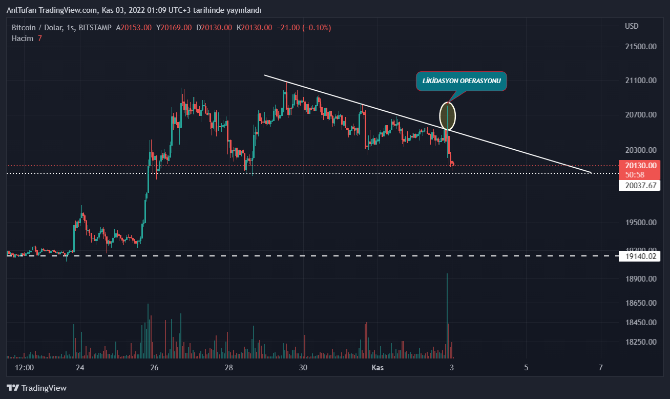 Amerikan Merkez Bankasının (FED) faiz artış kararı sonrasında 20.800 dolara kadar yükselen BTC, sürecin ilerlemesiyle birlikte 20.100 dolara kadar geriledi.