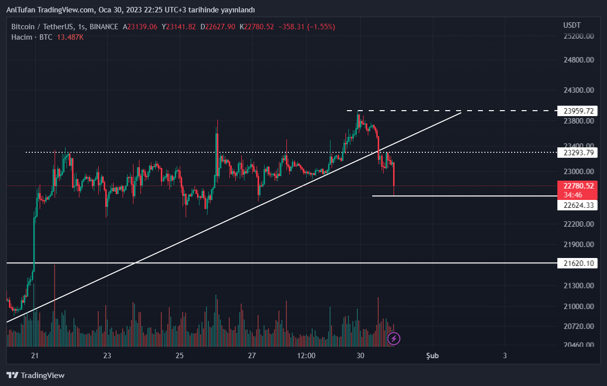 Lider kripto para birimi Bitcoin’in geçtiğimiz dakikalarda gerilediği 22.624 dolar seviyesinin kritik öneme sahip olduğu gözlenmekte. Bu seviyenin de kırılması, BTC’nin 21.620 dolara gerilemesine neden olacaktır.
