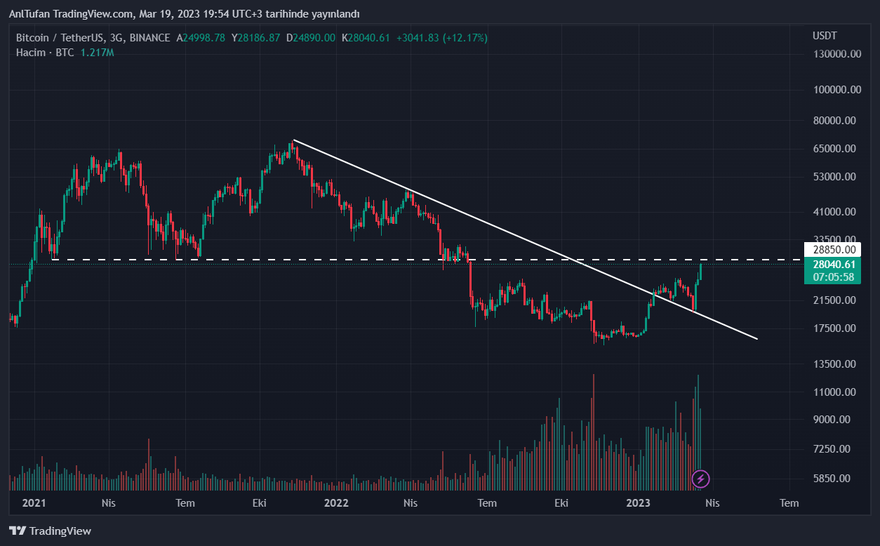 Psikolojik direnç olarak 28 bin dolar çok önemli olsa da, teknik analiz bakımından en kritik noktanın 28.850 dolar olduğu görülüyor. BTC’nin geçtiğimiz boğa döngüsünde 3 kez destek olarak çalışan bu noktayı geri kazanması gerekmekte.