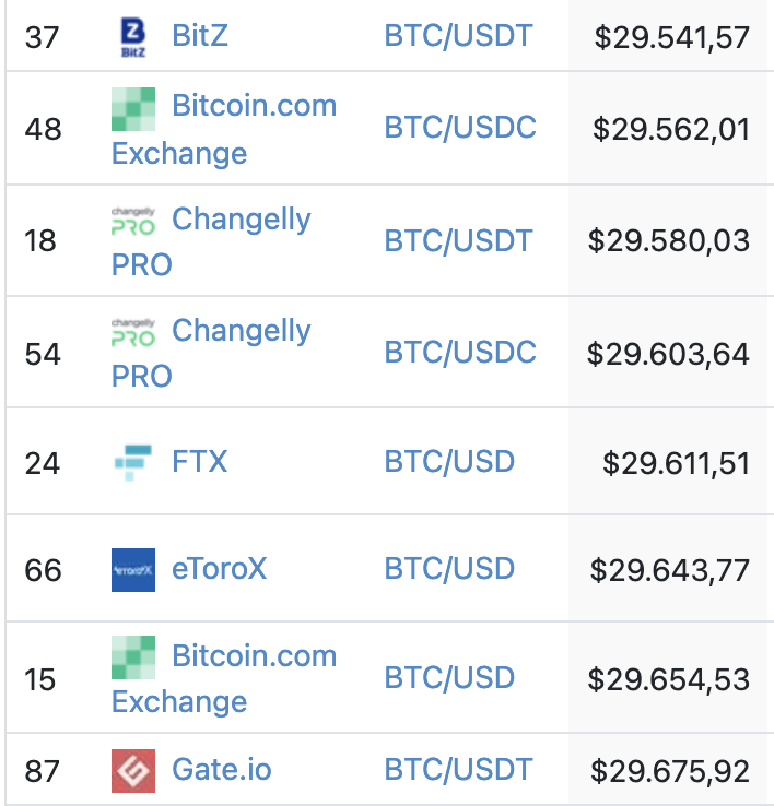 Lider kripto para birimi Bitcoin (BTC), basın saati itibarıyla önde gelen kripto para borsalarının birçoğunda 30.000 doların altına iğne attı. Bitcoin, Binance üzerinde kısa süreliğine 30.000 dolar altına geriledi ve an itibarıyla 29.000 dolardan işlem görmekte.