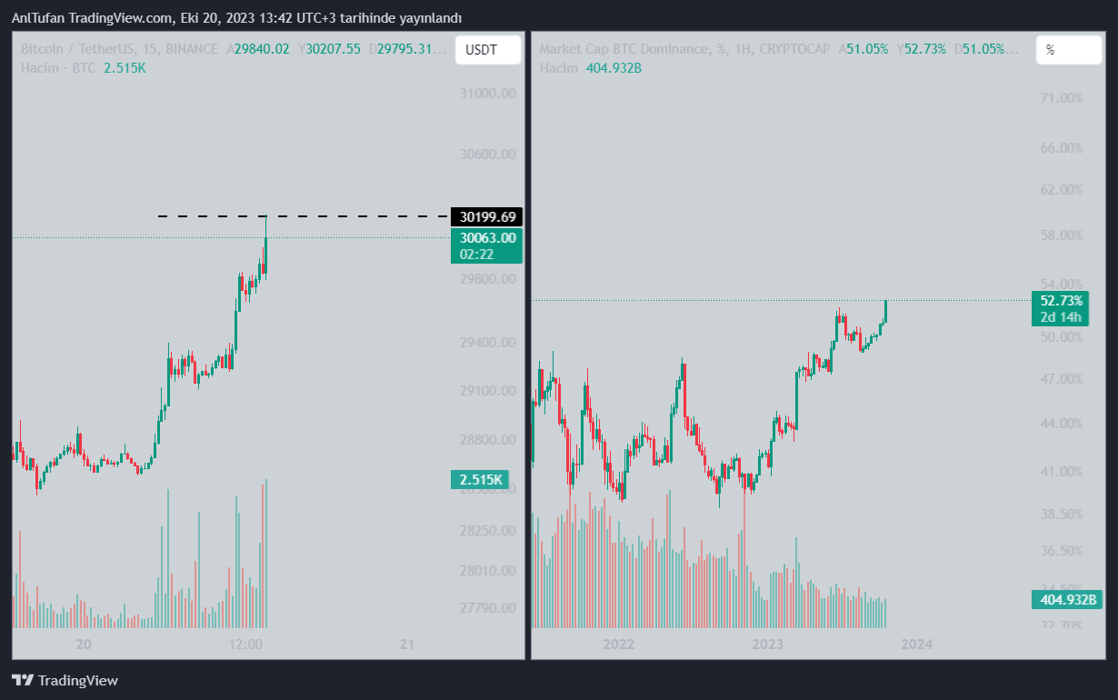 Altcoin’lerin dev yükselişler yaşayamamasının sebebinin BTC hakimiyetindeki artış olduğu görülüyor. BTC hakimiyeti bugün itibariyle %53’lü seviyelere çok yaklaştı.