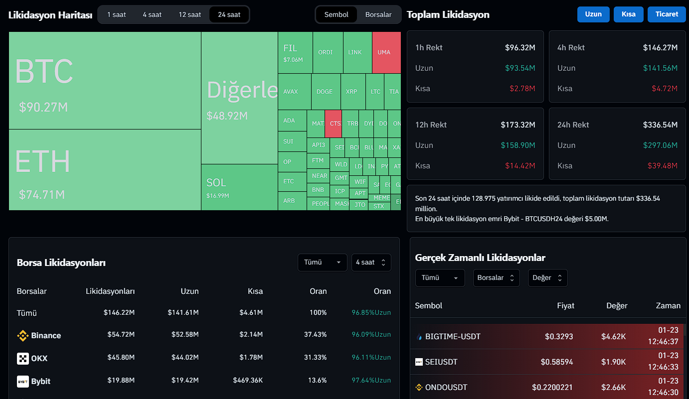Son 24 saat içerisinde 297 milyon dolarlık long pozisyon likit edilirken, sadece 39 milyon dolarlık short pozisyon tasfiye edildi.