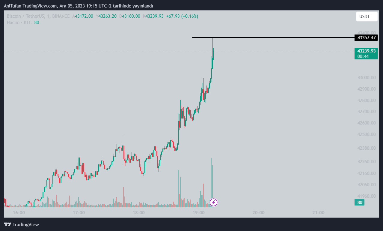 Bitcoin (BTC) Binance spot piyasada USDT paritesinde kısa bir süre önce 43.357 doları gördü.