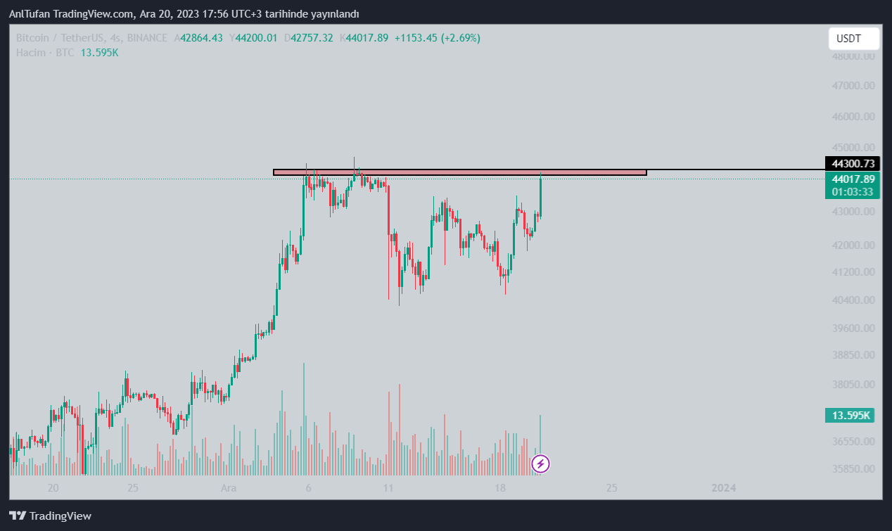 Şu an itibariyle Bitcoin her ne kadar 44 bin dolar direncinden reddedilmiş gibi gözükse de, BTC halen kritik direnç seviyesinden hemen altında işlem görmeye devam ediyor.
