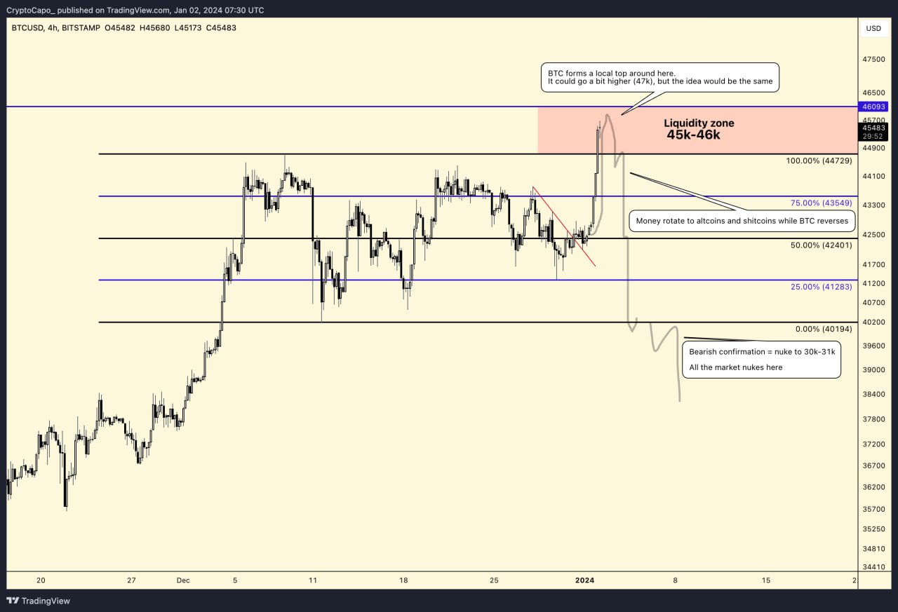 Spot ETF kararı öncesi Bitcoin’in sert yükselmesi yatırımcıların heyecanını artırsa da, çöküş tahminleri ile gündeme gelen Crypto Capo yine bir düşüş tahmini paylaştı.