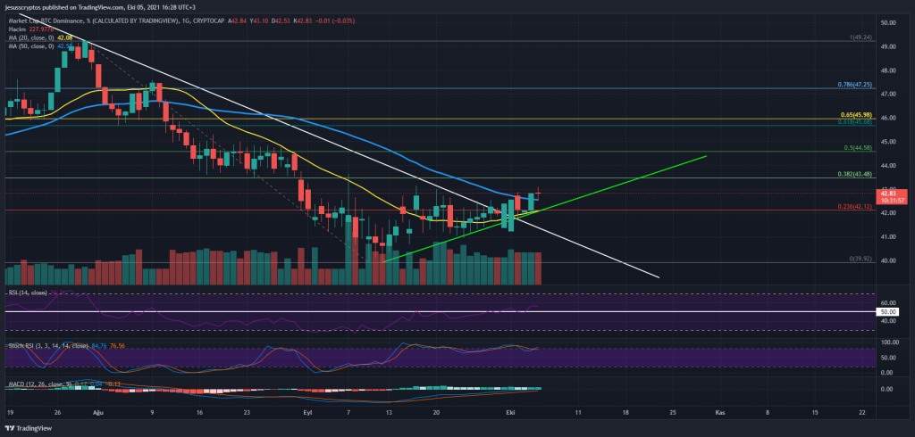 Günlük grafikte 12 Eylül’den bu yana giderek yükseldiği görülen piyasadaki BTC hakimiyeti, son yaşanan yükselişle beraber 42,82 civarında bulunuyor.