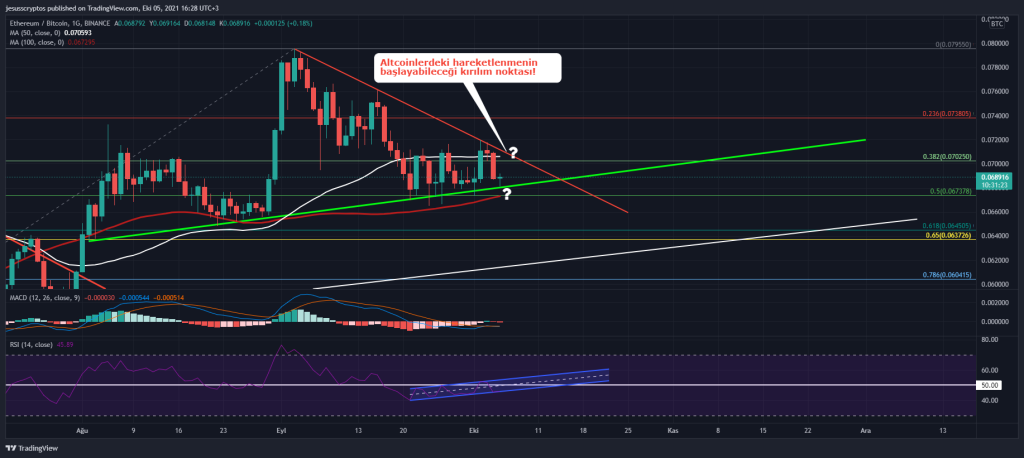 Günlük grafik üzerinde MA100 (0,0673 BTC) ve MA50 (0,0706 BTC) seviyeleri arasında kalan ETH/BTC paritesi, grafik üzerinde gösterilen kırmızı direnç çizgisi ve yeşil yükselen trend çizgisi arasında sona yaklaşıyor. Burada bir kırılım yapacağı düşünülen paritenin kırılım yönü altcoinler için oldukça büyük önem taşıyor. Hatta bu kırılımın BTC hakimiyeti ve TOTAL2 tablolarıyla eş zamanlı olacağı öngörülüyor.