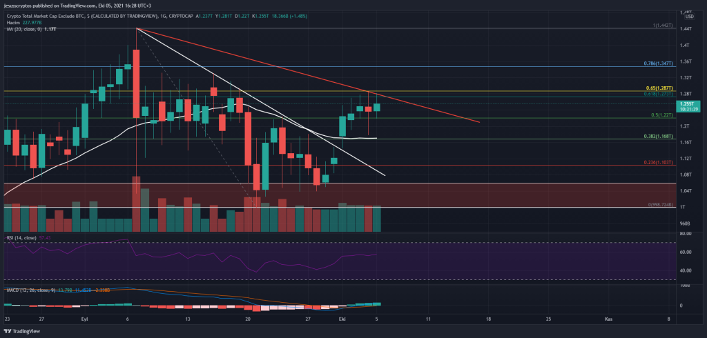 Piyasadaki altcoinlerin toplam değerini ifade eden TOTAL2 grafiğinde öncelikle 1 trilyon dolar üzerinde olunması güzel ancak burada değerin 1,273 T – 1,287 T dolar arasındaki direnci geçmekte zorlandığı görülüyor.