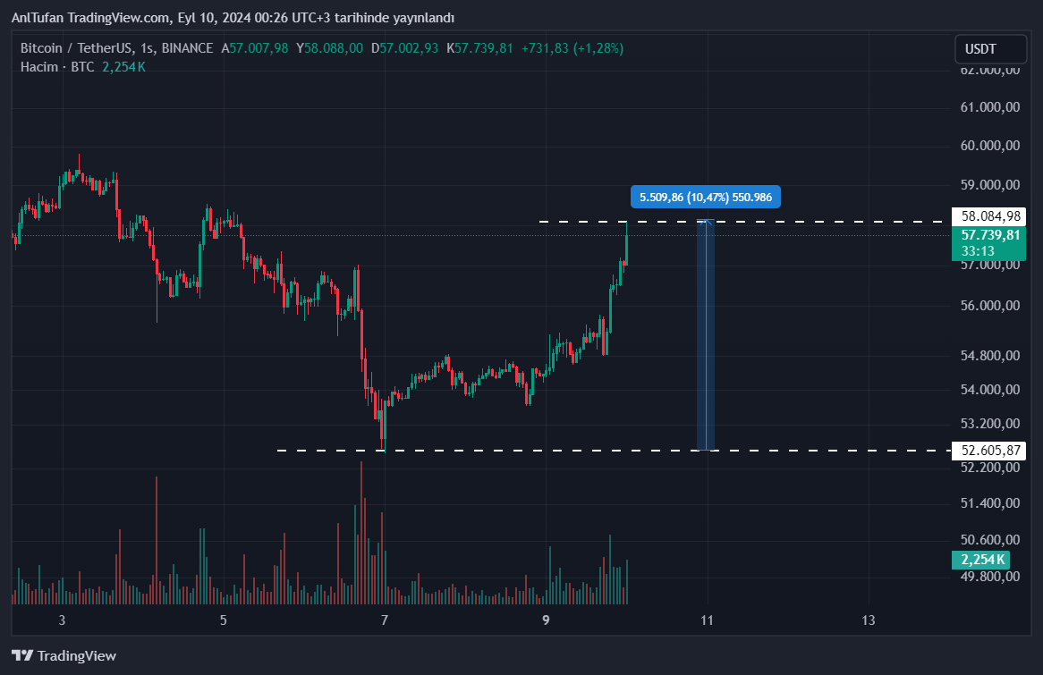 Şuan itibariyle Bitcoin 58 bin dolar seviyesini aşamamış olsa da, halen yükseliş trendinin devam ettiği görülüyor. Önümüzdeki süreçte BTC, short likidasyonları ile 60 bin dolar psikolojik kritik seviyeye ulaşabilir.