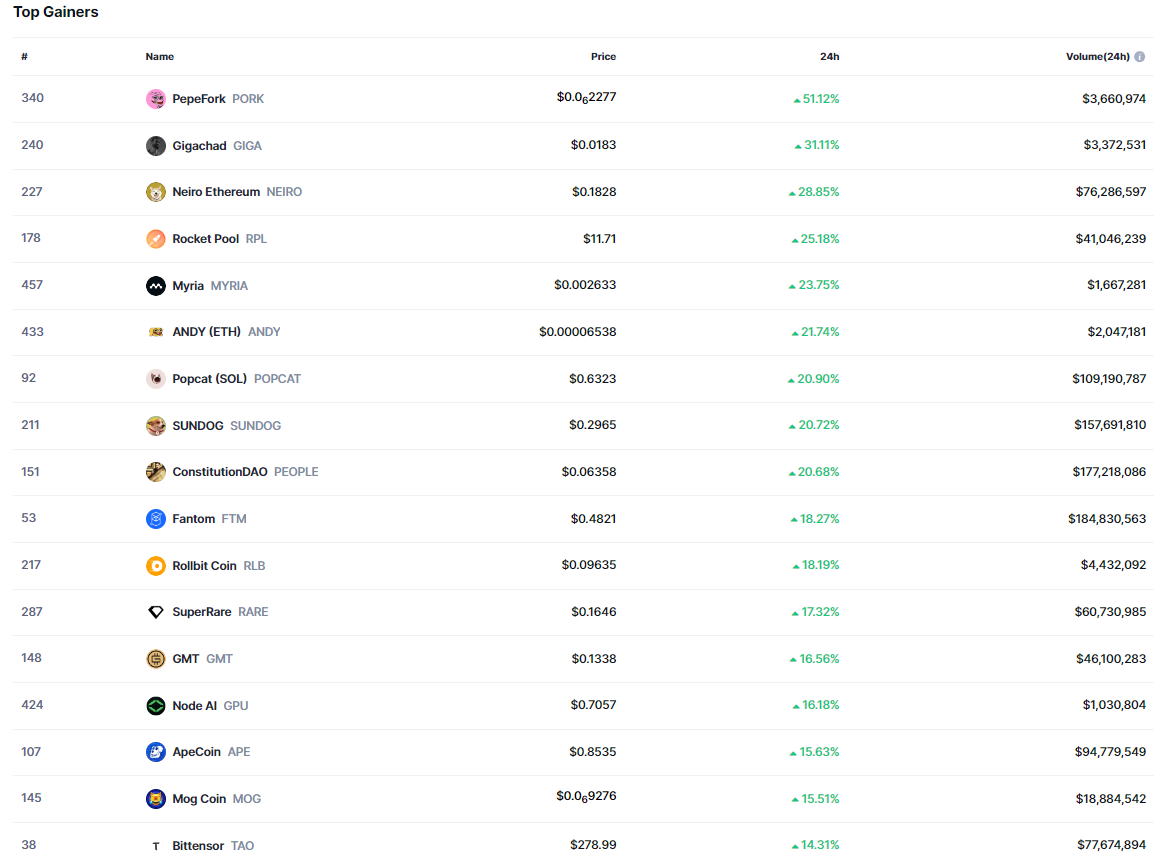 PORK’un yanı sıra GIGA, NEIRO, RPL, MYRIA, ANDY, POPCAT, SUNDOG ve PEOPLE‘nin de %20’den fazla değer kazandığı gözlemlendi.
