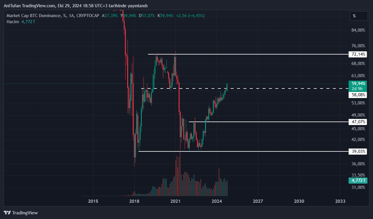 %58 direncini de aşan Bitcoin hakimiyeti, artık altcoin’lerinde yükselişe geçebilmesi için bir düşüş yaşaması gerekiyor. 1 Kasım 2022 tarihinde yükseliş trendine giren BTC dominansı, 2 yıldır durmaksızın yükselmekte.