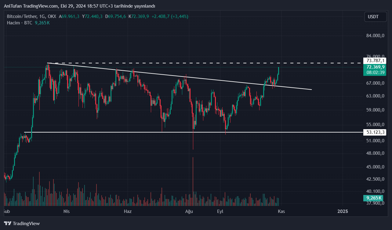 Bugün itibariyle 72 bin dolar seviyelerini de aşan Bitcoin, artık ATH seviyesi olan 73.777 doları hedeflemiş gibi duruyor. Önümüzdeki süreçte BTC’nin ATH seviyesini de aşacağı ve yükselişlerine devam edeceği bekleniyor.