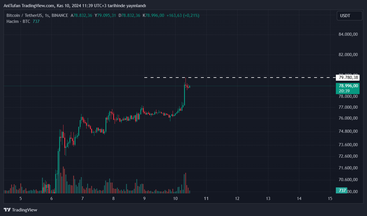 Kripto para sektöründe artışlar devam ediyor. Lider kripto para birimi Bitcoin (BTC) bu sabah saatlerinde yaşadığı yükselişler ile dikkat çekti. Bugün TSİ 07.00 – 08.00 saatleri arasında kısa bir süre içerisinde ani yükseliş yaşayan Bitcoin 79.780 doları gördü.