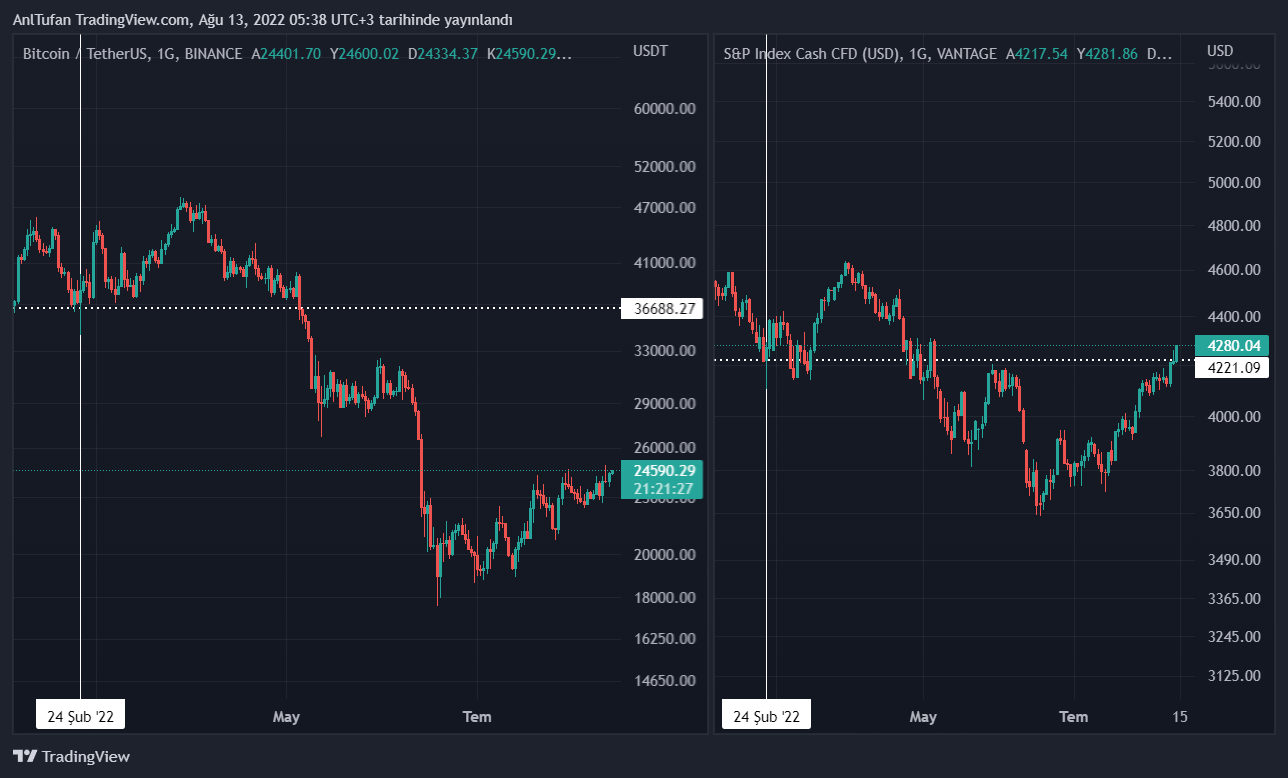 SP 500 ile aynı performansı sergilemesi halinde en kötü ihtimal ile 36 bin dolar seviyelerine kadar yükselmiş olması gereken BTC, halen 23 bin – 25 bin dolar aralığında akümüle olmaya devam ediyor.