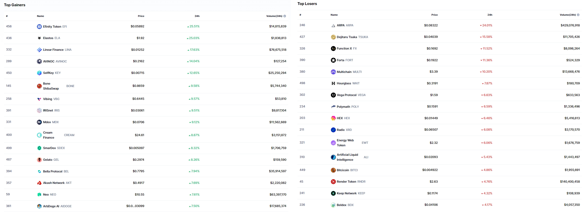 Son 24 saat özelinde ilk 500 kripto para birimi içerisinde EFI gibi yüzde 25 oranında yükseliş yaşayan altcoin’ler bulunsa da, ARPA gibi yüzde 24’lük düşüş yaşayan ürünlerde bulunmakta.