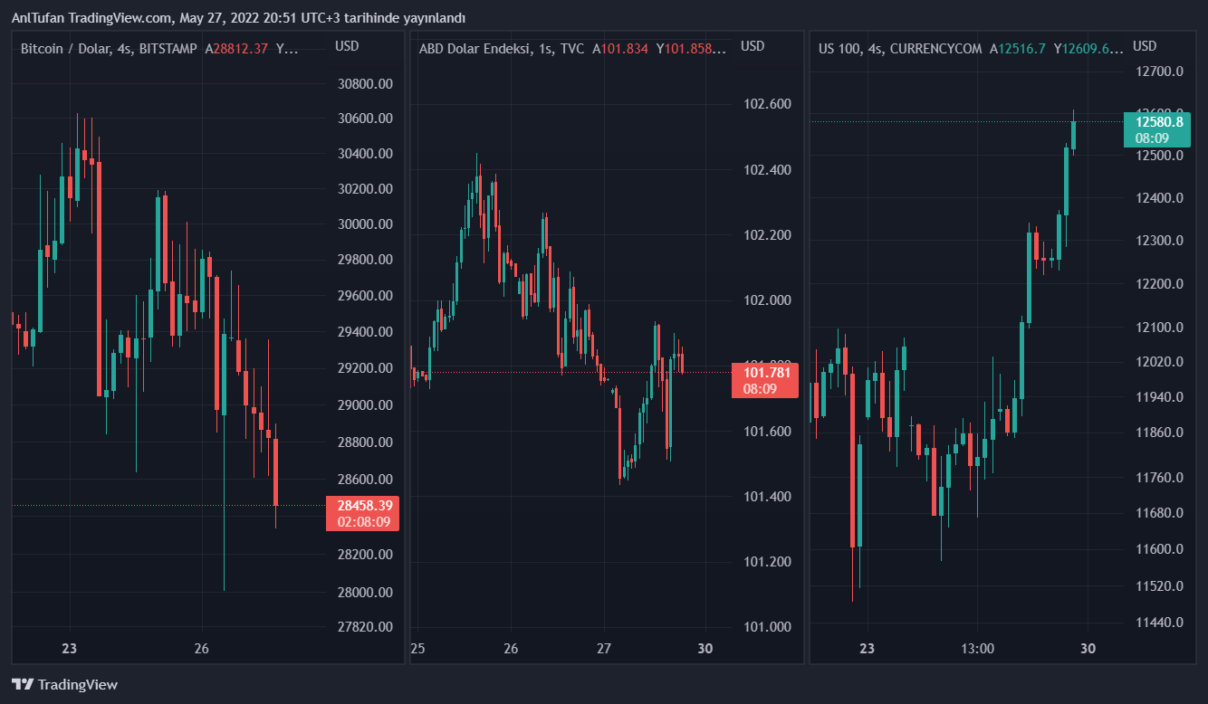 DXY‘nin yükseliş yaşadığı dönemlerde değer kaybına uğrayan lider kripto para birimi, DXY’nin düşüş yaşadığı günlerde ise yükseliş yaşaması beklenmekte. Keza ABD borsaları da bu hareketleri destekler cinsten hamleler yapıyor.