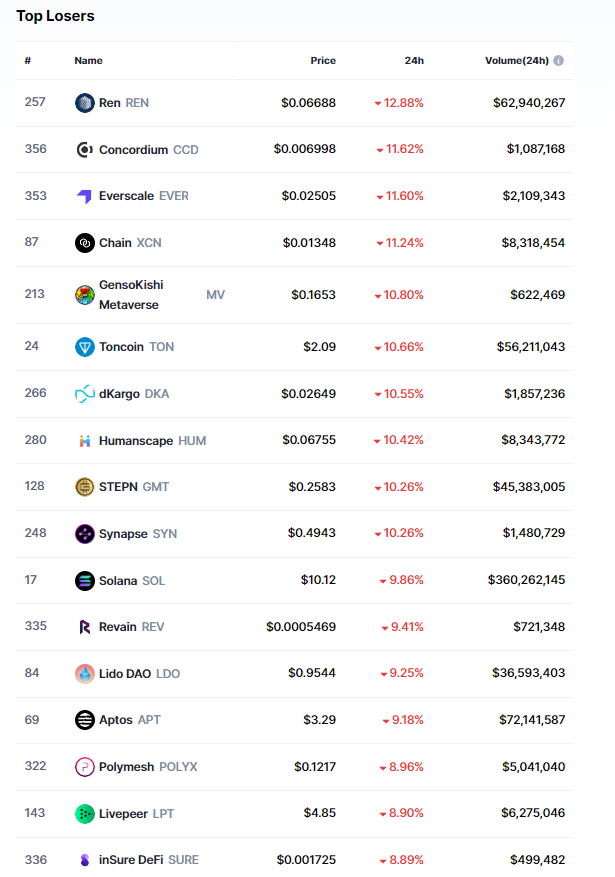 REN dışında aşağıda yer alan altcoin’lerin de yüzde 10’dan fazla düşüş yaşadığı görülüyor: