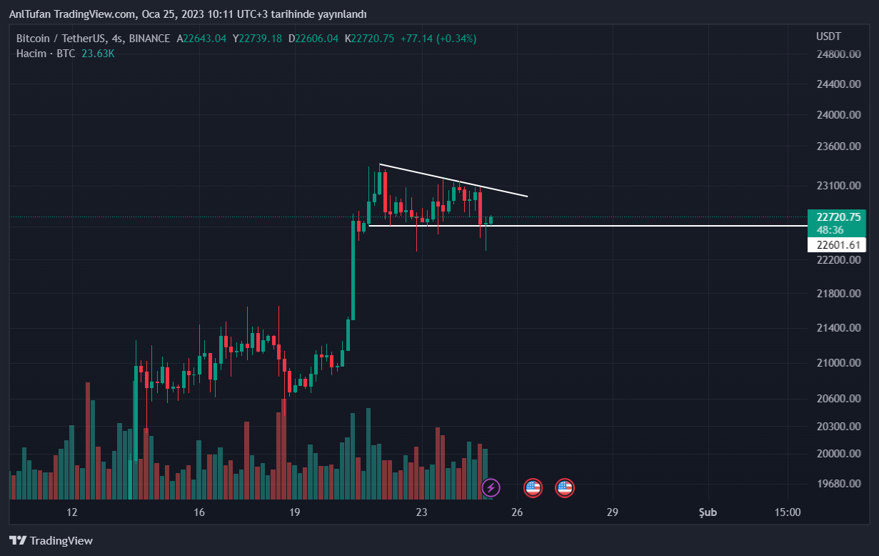 Lider kripto para birimi Bitcoin’in (BTC) 4 saatlik mumu yine 22.600 dolar desteğinin üzerinde kapattığı görüldü. Tüm satıcı baskısını absorbe eden BTC, yükseliş yapısını bozmamayı başardı.