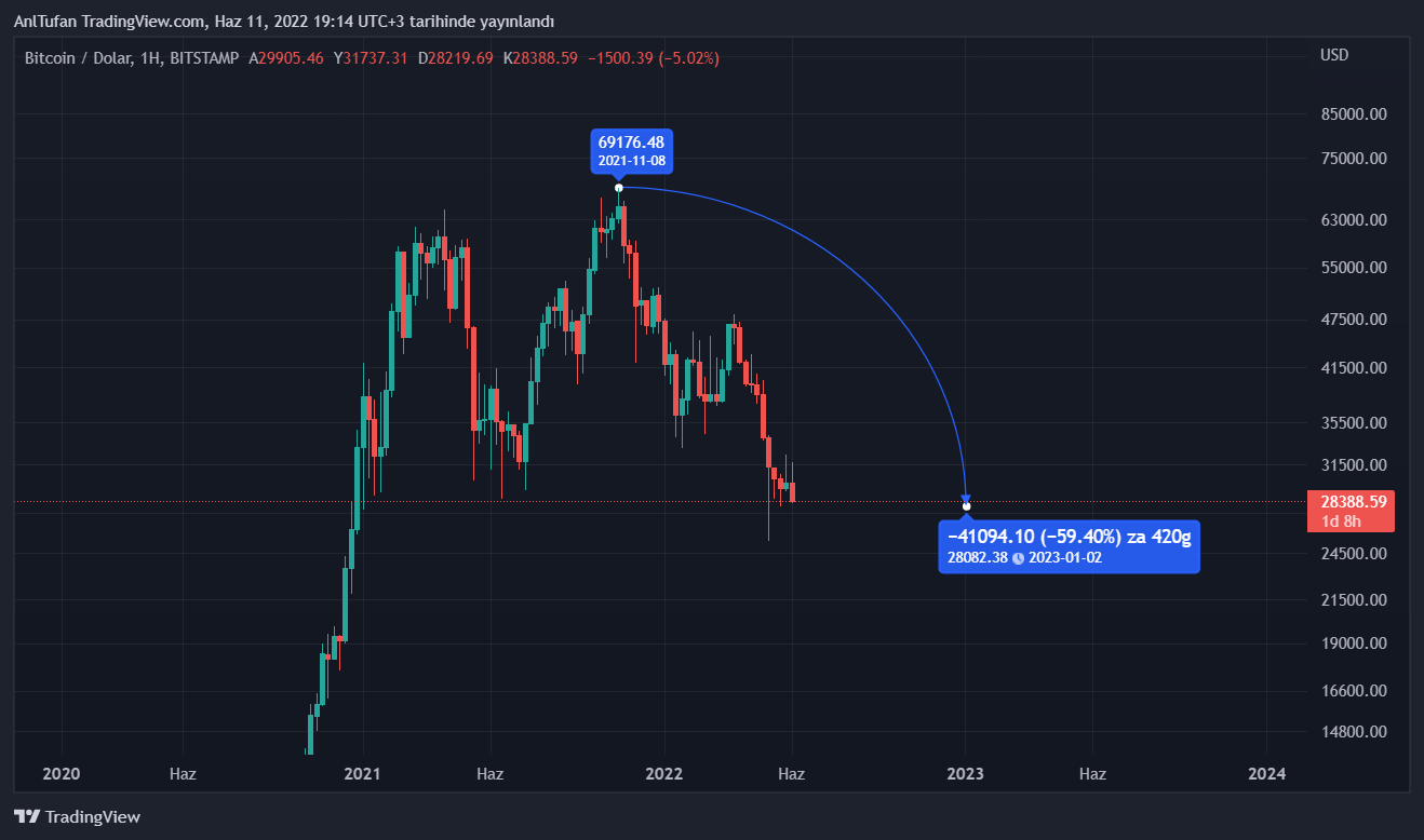 69 bin dolar tepesinden bu yana çok sert değer kaybeden BTC, enflasyonun dünyada yükseliş yaşadığı dönemlerde %60 oranında düşüş yaşamış durumda.