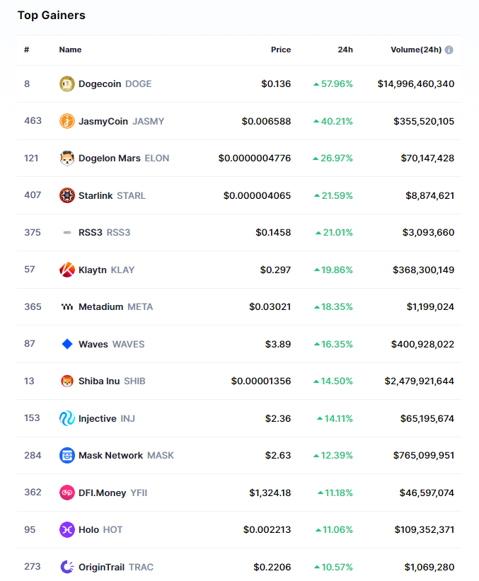Başarılı bir veri sağlayıcısı olan CoinMarketCap’in aktardıklarına göre, ilk 500 kripto para birimi içerisinde olan ve aşağıdaki listede yer alan altcoin’ler, son 24 saat içerisinde yüzde 20’den fazla yükseliş yaşamayı başardı: