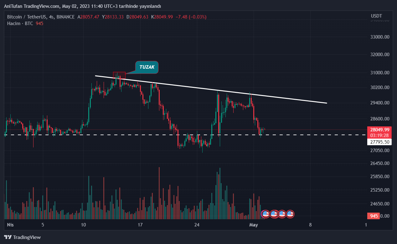 Şuan itibariyle Bitcoin her ne kadar 27.800 dolar destek bölgesinin alt trendi olan 27.200 dolara bir düşüş yaşamamış olsa da, 27.800 doların kaybedilmesi halinde 27.200 dolar seviyelerine bir düşüş meydana gelebilir.