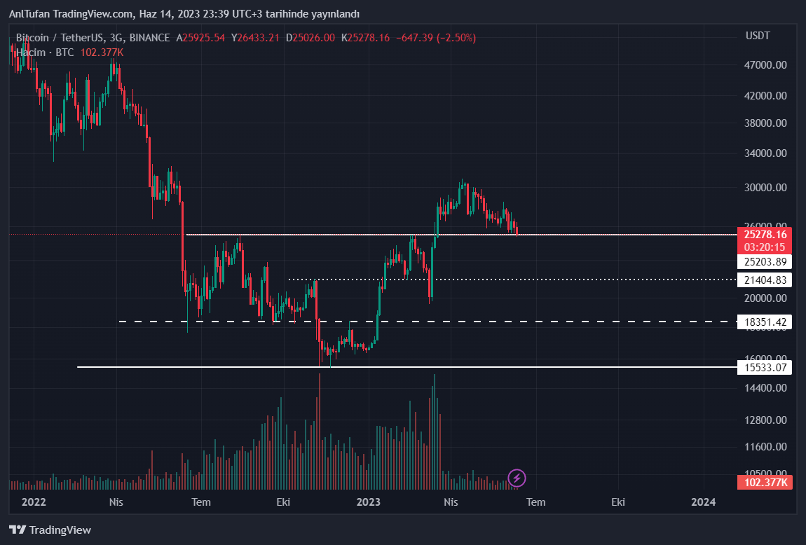 Son yaşanan düşüşler ile birlikte Bitcoin major destek seviyesi olan 25.200 dolar seviyelerine geriledi. Türev piyasadan yüklü BTC short işlemlerin açılmış olması, yeniden bireysel yatırımcıların zarar etmesine neden oldu.