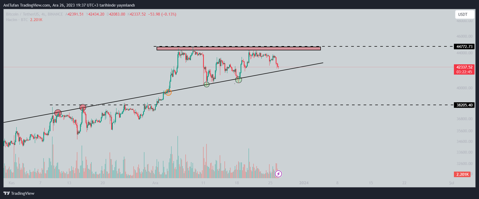 Lider kripto para birimi Bitcoin’in (BTC) 41.800 dolarda yer alan yükselen trendinden güç alması durumunda ise 44 bin – 45 bin dolar direnç bölgesine yükseldiğini görebiliriz.
