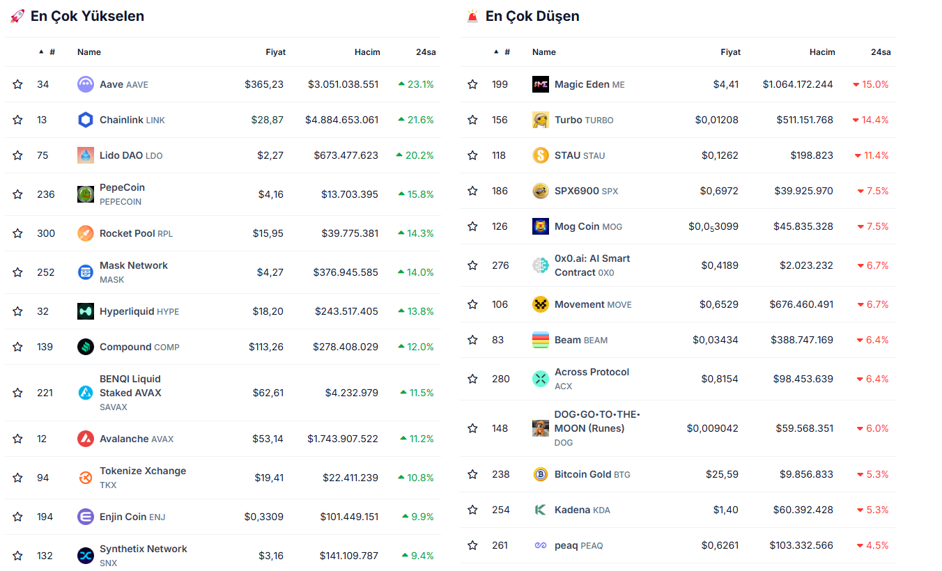 Bugünün en çok düşüş yaşayan altcoin’leri ise sırasıyla ME, TURBO, STAU, SPX ve MOG oldu.