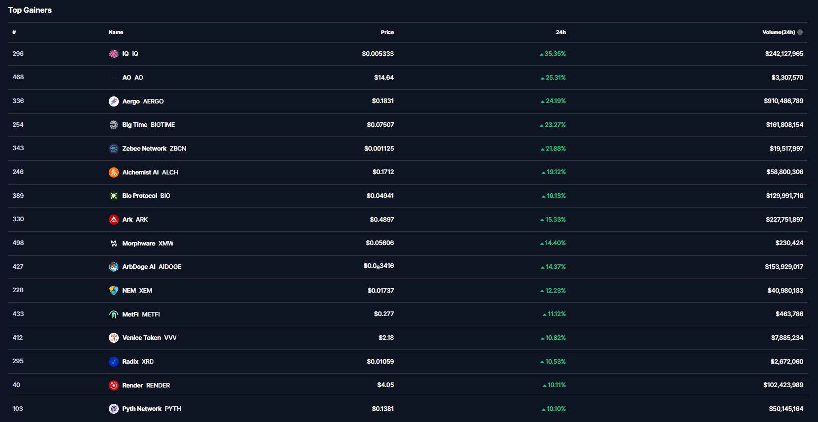 Başarılı bir veri sağlayıcısı olan CoinMarketCap’in aktardığı bilgilere göre son 24 saat özelinde ilk 500 kripto para birimi içerisinde en büyük yükselişi %35 ile birlikte IQ isimli altcoin gerçekleştirdi.