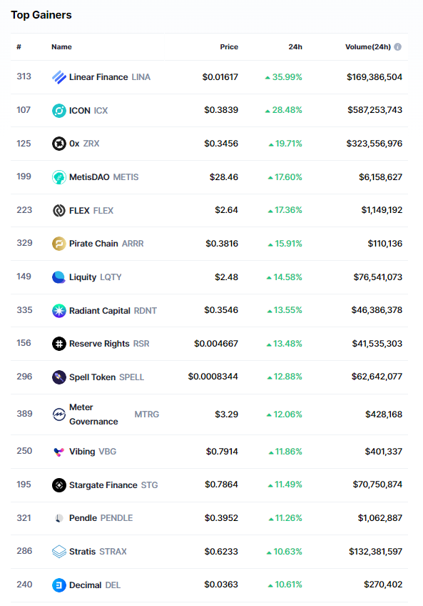 Başarılı bir veri sağlayıcısı olan CoinMarketCap’in aktardıklarına göre, son 24 saat özelinde ilk 500 kripto para birimi içerisinde en büyük yükselişi Linear Finance (LINA) isimli altcoin yaşadı.