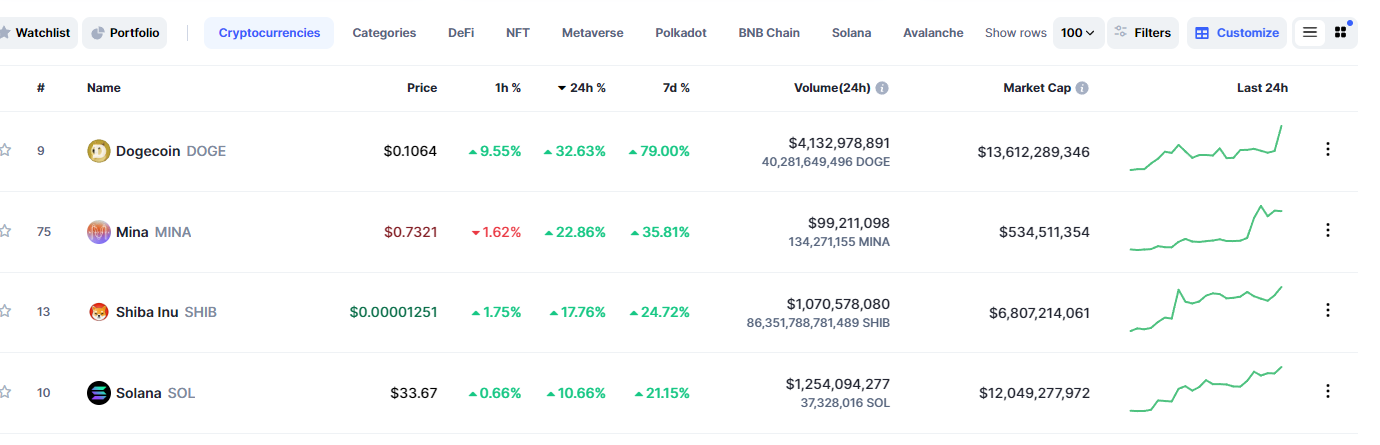 Bu altcoin’ler arasında tabi ki Dogecoin‘in yaşadığı yükselişler sektöre damga vurmakta. Bugün özelinde yüzde 30’a yakın değer kazanan DOGE, kendi ile beraber ezeli rakibi Shiba Inu‘nun da değer kazanmasına olanak sağladı.