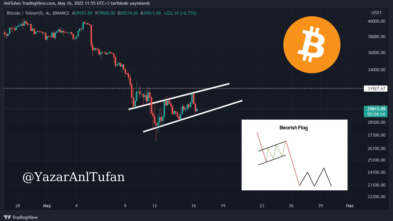 An itibariyle kritik bir bearish patern oluşturan BTC, ayı bayrağı formasyonuna benzer hareketler sergiliyor.