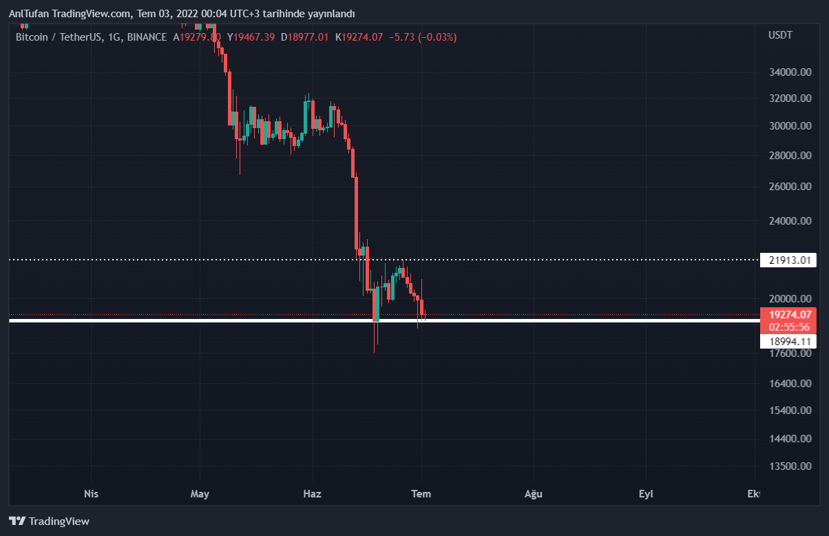 Her ne kadar BTC bir trend dönüş formasyonu olan ikili dip paterni oluşturmaya çalışıyor gibi gözükse de, yeni düşüşler yaşamaması için artık 19 bin dolar noktasından yeni bir yükseliş trendi başlatması gerekmekte.
