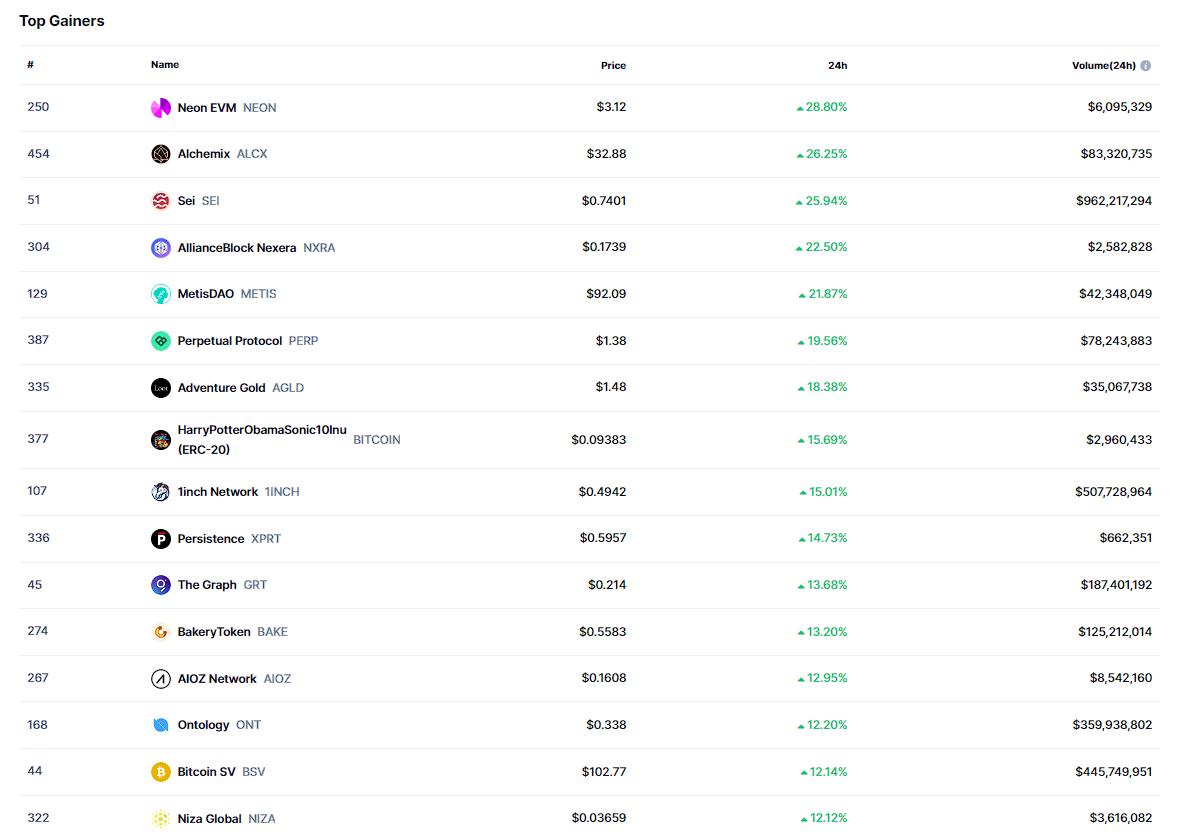 Başarılı bir veri sağlayıcısı olan CoinMarketCap’in aktardığı bilgilere göre son 24 saat içerisinde ilk 500 kripto para birimi içerisinde en büyük yükselişi Neon EVM (NEON) isimli altcoin gerçekleştirdi.