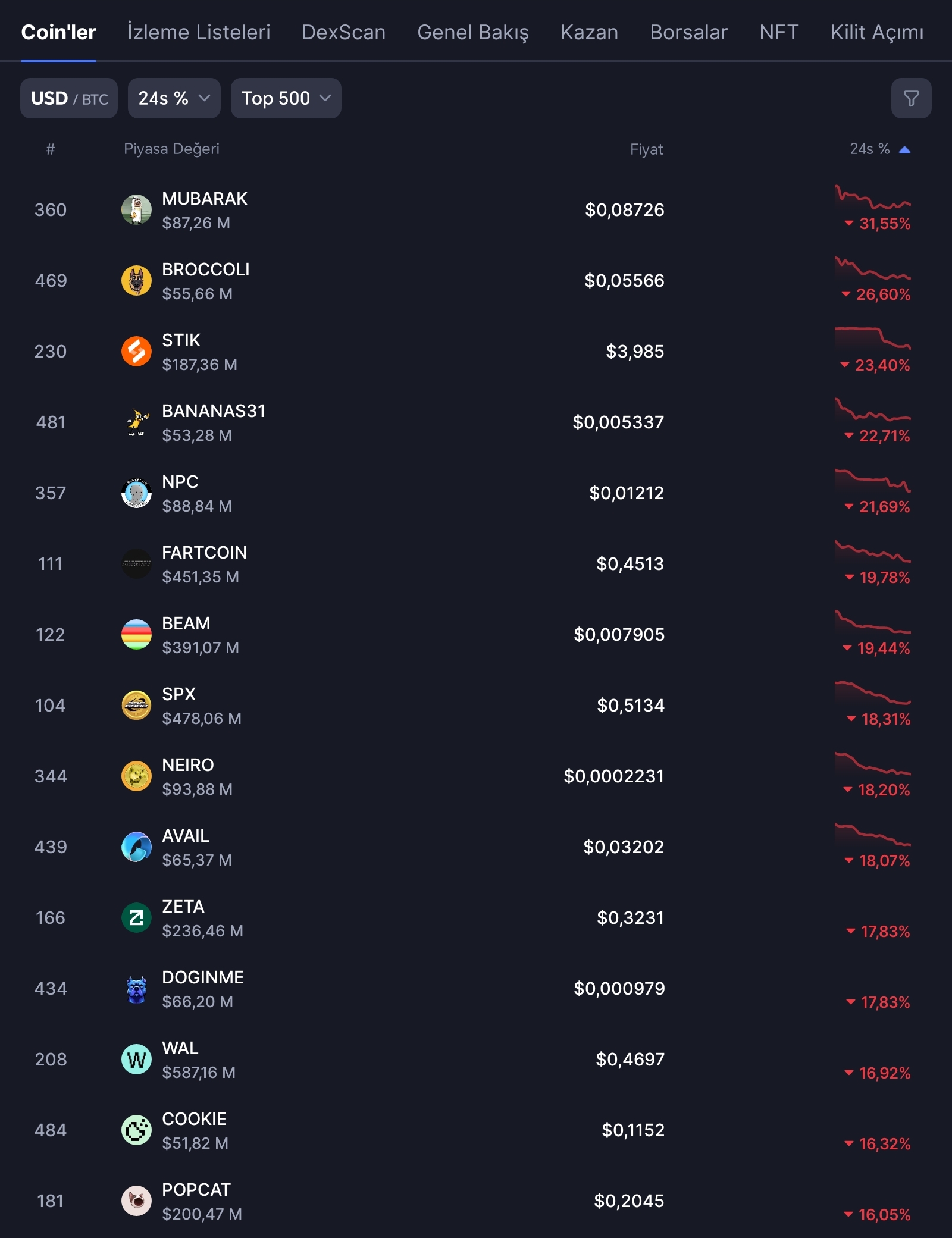 MUBARAK’ın yanı sıra BROCCOLI, STIK, BANANAS31, NPC, FARTCOIN ve BEAM‘in de bugün itibariyle %20’den fazla düşüş yaşadığı gözlemlendi.