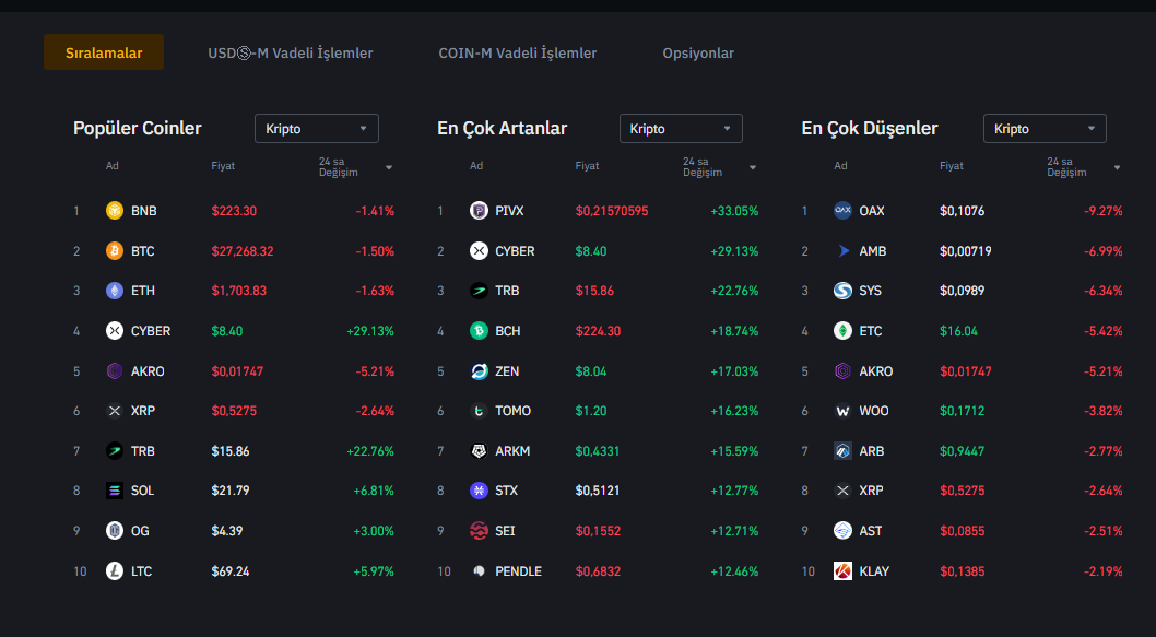 Son 24 saat içerisinde Binance’de listelenmiş hiçbir altcoin yüzde 10’dan fazla düşüş yaşamadı. En fazla değer kaybeden ürünler ise OAX, AMB, SYS, ETC ve AKRO oldu.