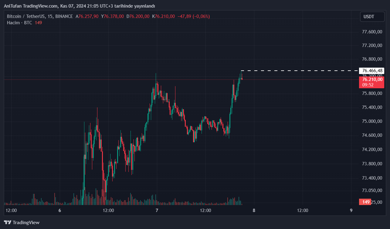 Geçtiğimiz dakikalarda ise Bitcoin tekrardan zirve tazeledi. BTC dün itibariyle 76.400 dolarda ATH yapmıştı. Kısa bir süre önce ise 76.466 dolara ulaşarak tekrar zirve tazeledi.