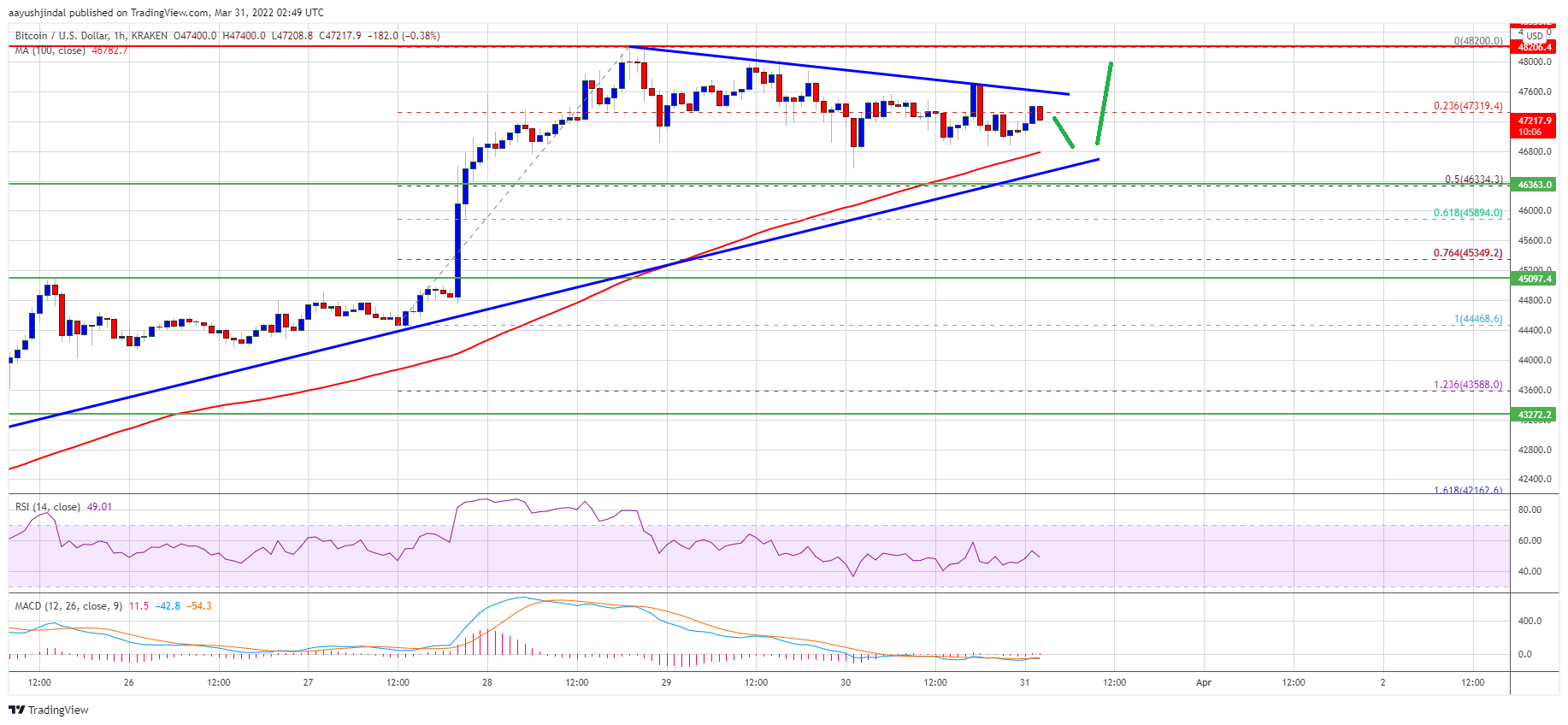BTC/USD teknik analizine bakıldığında fiyatın 100 saatlik basit hareketli ortalama yani 46.500 doların üzerinde kalmaya devam ettiği görülüyor. Bu durum devam ettikçe fiyat da güvende olacaktır.
