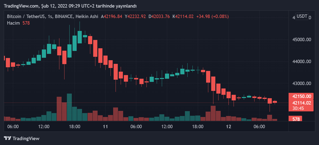 Hafta sonunun ilk saatleri itibari ile Binance borsasında, BTC 41. 688 dolar seviyesine iğne attı. Altcoinlerde ise durum daha vahim ve %10 üzerinde değer kayıpların yaşandığı görülüyor. Haberin yazıldığı sırada ise BTC 42.400 dolar seviyelerinden alınıp satılıyor.