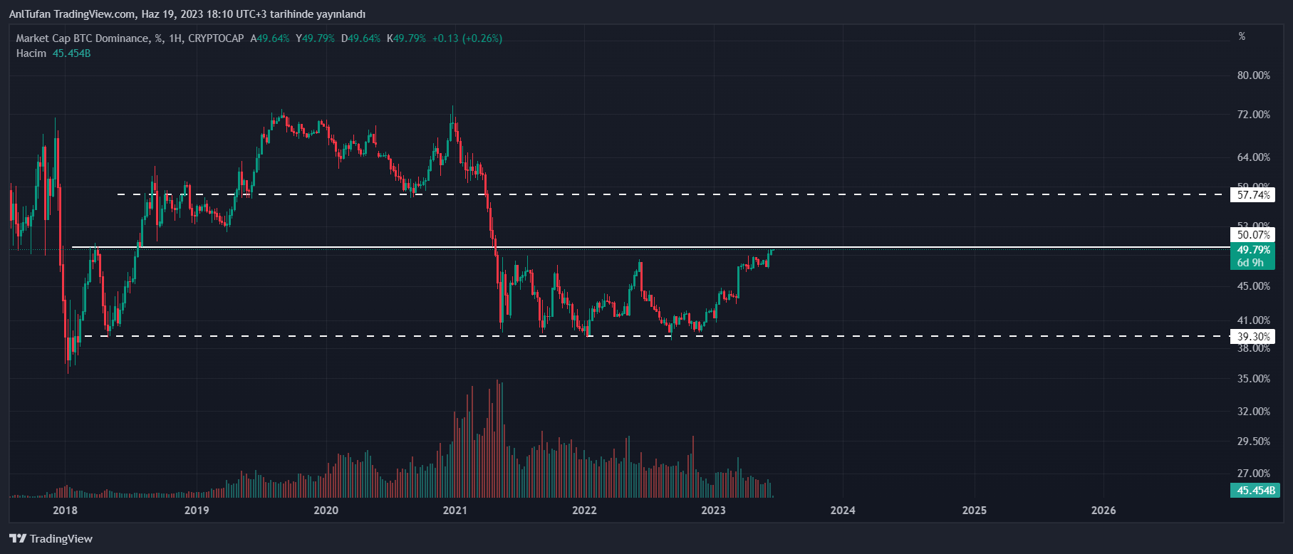 BTC dominans tablosu bu yıl özelinde yüzde 40’lı seviyelerden yüzde 50’ye yükseldi. Son süreçte Bitcoin hakimiyeti yüzde 50 direncini zorluyor.