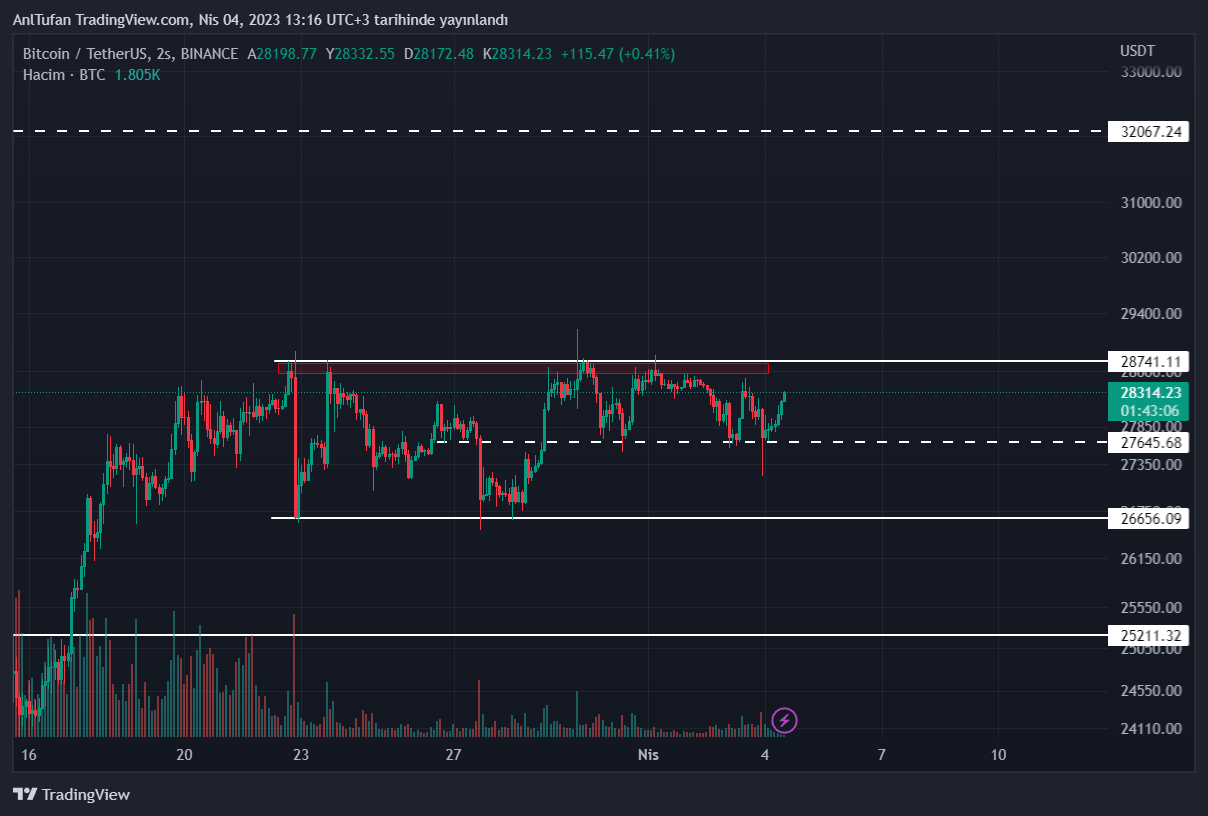 Şuan itibariyle ise lider kripto para birimi Bitcoin (BTC), 28.300 dolar seviyelerinden işlem görüyor. Önümüzdeki günlerde Bitcoin’in FUD haberlerin etkisi altında kalmaması halinde 28.800 dolar direncini aşması beklenmekte.