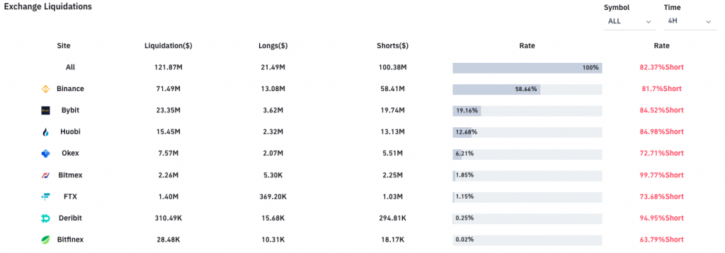 Likidasyonlar konusunda zirveyi Binance kripto para borsası işgal ederken onun altında Bybit, onun altında Huobi ve devamında OKEx yer almakta. Likidasyonların özellikle kurumsal yatırımcıların alım satım yaptığı Deribit üzerinde %94 oranında short şeklinde olması ise bu çalımdan en çok kurumsal yatırımcıların zararlı çıktığını göstermekte.