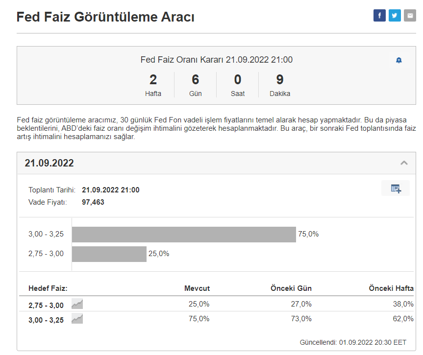 - 21 Eylül tarihinde ise Amerikan Merkez Bankası (FED), yeni faiz artış kararını açıklayacak.